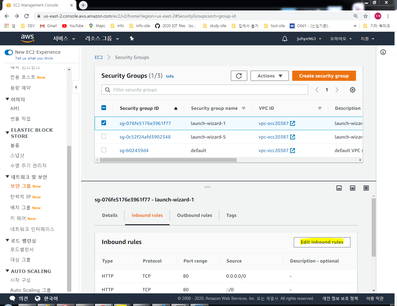 설정을 편집할 보안그룹을 체크하면 인바운드 규칙을 편집할 수 있는 창이 뜹니다. Edit inbound rules를 눌러주세요.